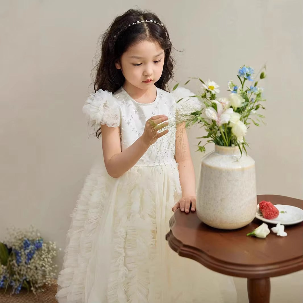 Available in white with sizes ranging from 90-140cm, it caters to young girls at different growth stages. With 500 pieces in stock, it supports quick order fulfillment, and a low MOQ of 1 piece makes it accessible for individual buyers, small boutiques, or parents seeking a standout summer dress.